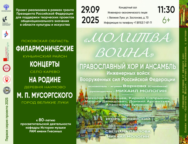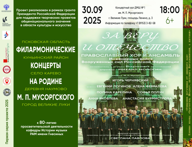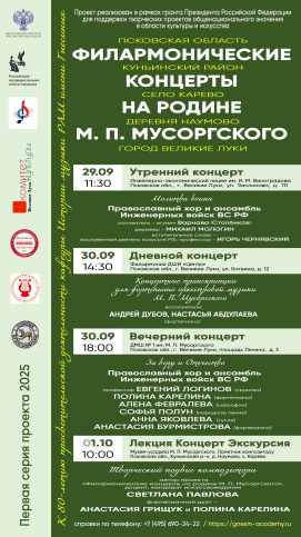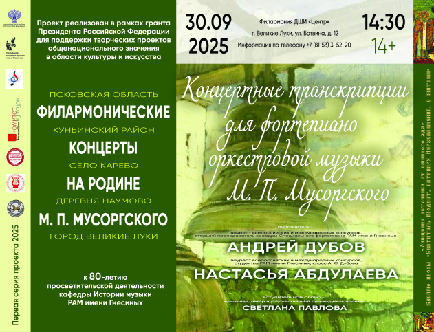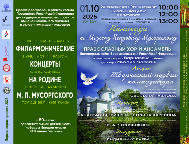«Филармонические концерты на родине М. П. Мусоргского» – новый проект РАМ имени Гнесиных на юге Псковской области. Он приурочен к 80-летию просветительской деятельности кафедры истории музыки. Автор и руководитель проекта – кандидат искусствоведения, доцент С. А. Павлова и музыканты академии – продолжают творческую работу, начатую в предыдущем «Гнесинском фестивале “Диалог на родине композитора” Модест Мусоргский 2025». Нынешний проект реализуется при поддержке Гранта Президента Российской Федерации для творческих проектов общенационального значения в области культуры и искусства, с участием Псковского объединенного музея-заповедника и Комитета культуры Администрации города Великие Луки.