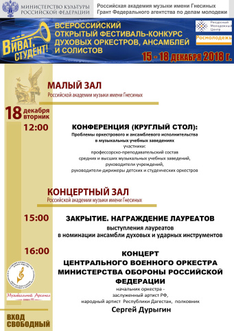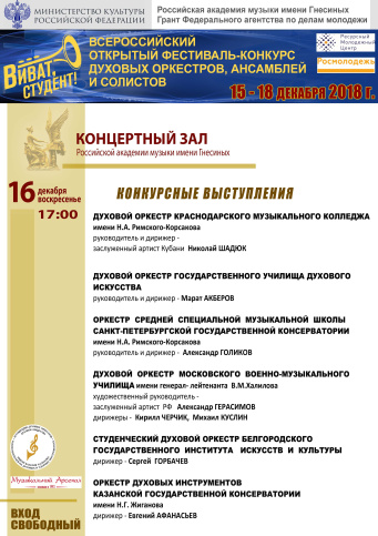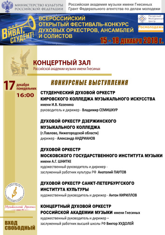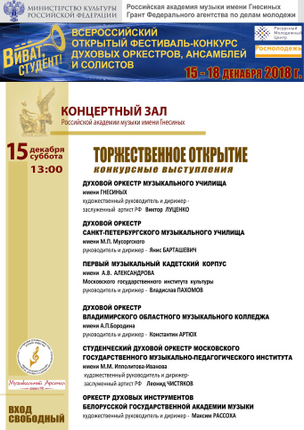 Всероссийский открытый фестиваль-конкурс духовых оркестров, ансамблей и солистов «Виват, студент!» (далее Фестиваль-конкурс) проводится с 15 по 18 декабря 2018 года в концертных залах Российской академии музыки имени Гнесиных.