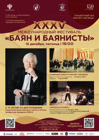 15 декабря в 19:00 к 75-летию народного артиста России, профессора РАМ имени Гнесиных Фридриха Робертовича Липса приглашаем на творческий вечер маэстро. В концерте примет участие Камерный оркестр РАМ имени Гнесиных (дирижер – Андрей Рейн) и ансамбль «Piazzolla-studio», созданный Фридрихом Липсом.