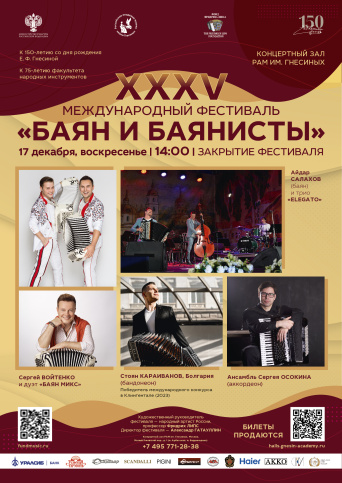 На закрытии фестиваля 17 декабря в 19:00 выступят Сергей Войтенко и дуэт «Баян Микс», Айдар Салахов (баян) и трио «Elegato», победитель международного конкурса в Клингентале (2023) Стоян Караиванов (Болгария, бандонеон) и Ансамбль Сергея Осокина (аккордеон).