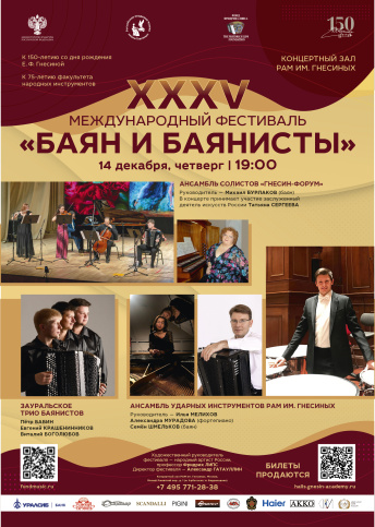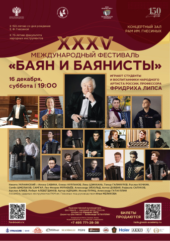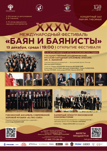 C 13 по 17 декабря 2023 года в Концертном зале Российской академии музыки имени Гнесиных состоится ежегодный Международный фестиваль «Баян и баянисты». В этом году он приурочен к 150-летию со дня рождения Е. Ф. Гнесиной и к 75-летию факультета народных инструментов Академии.