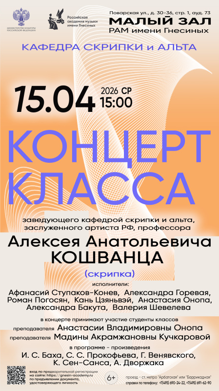 Концерт класса заведующего кафедрой скрипки и альта, заслуженного артиста РФ, профессора А. А. Кошванца (скрипка)