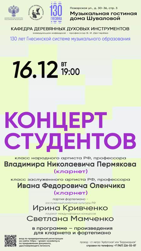 Концерт студентов класса народного артиста РФ, профессора В. Н. Пермякова (кларнет) и класса заслуженного артиста РФ, профессора И. Ф. Оленчика (кларнет)