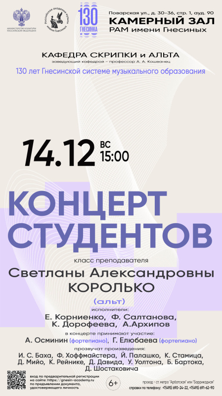 Концерт студентов класса преподавателя С. А. Королько (альт)