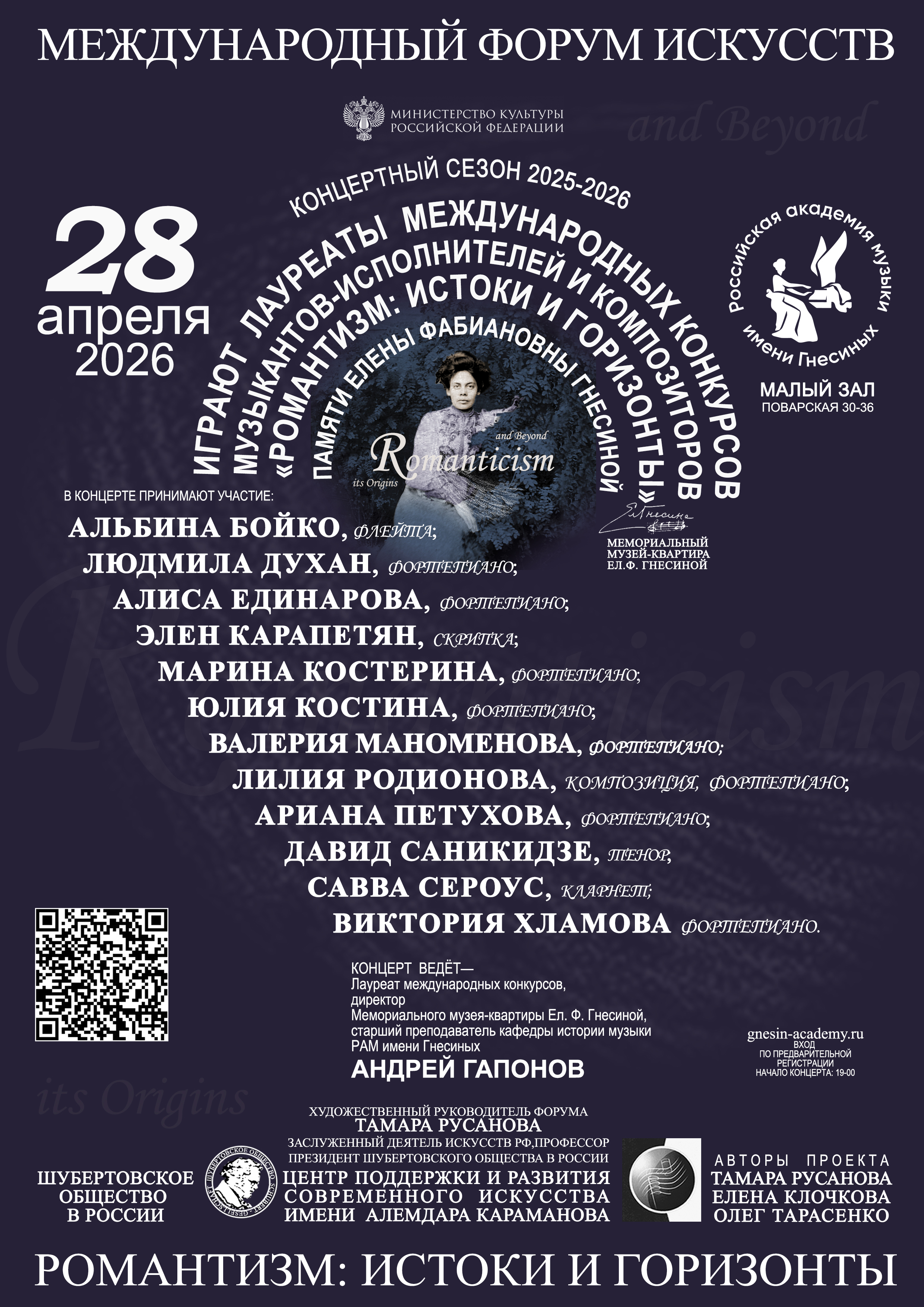 Международный форум искусств «Романтизм: истоки и горизонты» вновь представляет концерт лауреатов конкурса памяти Е.Ф.Гнесиной. В исполнении талантливых молодых музыкантов прозвучит музыка разных эпох: И.С. Баха, И. Брамса, А. Дворжака, П. Чайковского, С. Рахманинова, С. Прокофьева, А. Хачатуряна, Л. Родионовой.