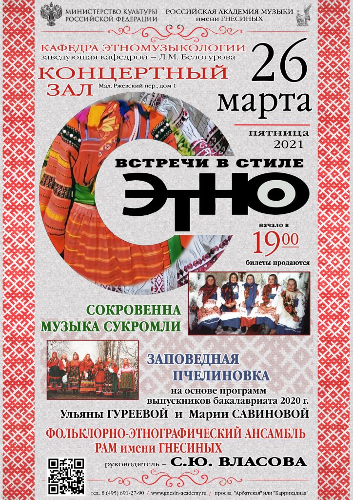 - но имеете счастливую возможность узнать и прочувствовать 26 марта в 19.00 в Большом зале Российской академии музыки имени Гнесиных. Долгожданная «послековидная» «Встреча в стиле «ЭТНО» будет посвящена подлинной, уникальной музыке русского запада и юга (Смоленская и Воронежская области).