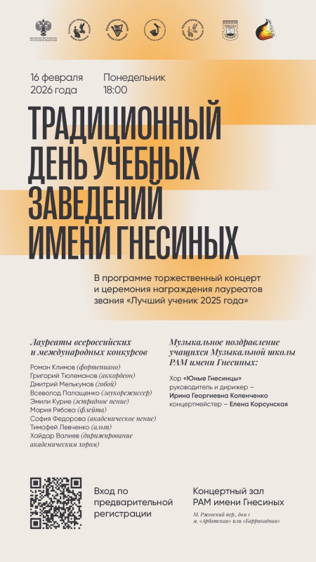 16 февраля 2026 года КОНЦЕРТНЫЙ СОСТАВ хора принимает участие в праздничном концерте, посвященном Традиционному дню учебных заведений имени Гнесиных!