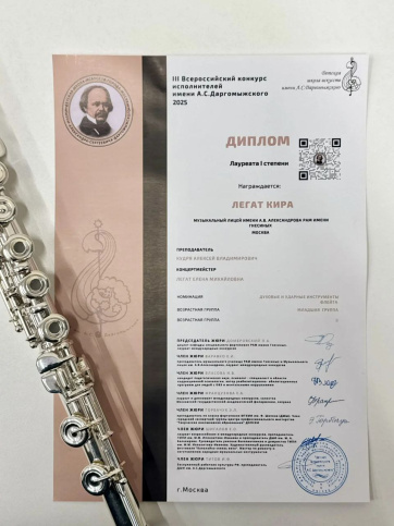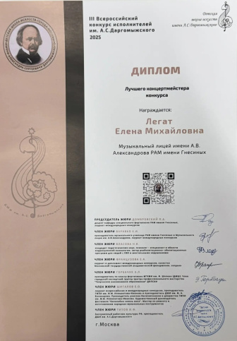 Ученица 2 класса Музыкального лицея имени А. В. Александрова РАМ имени Гнесиных Легат Кира стала победительницей III Всероссийского конкурса исполнителей имени А. С. Даргомыжского.