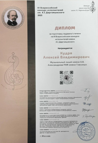 Высокий результат на столь значительном творческом состязании является свидетельством профессиональной подготовки ученицы и огромной работы ее педагога — преподавателя Кудри Алексея Владимировича.