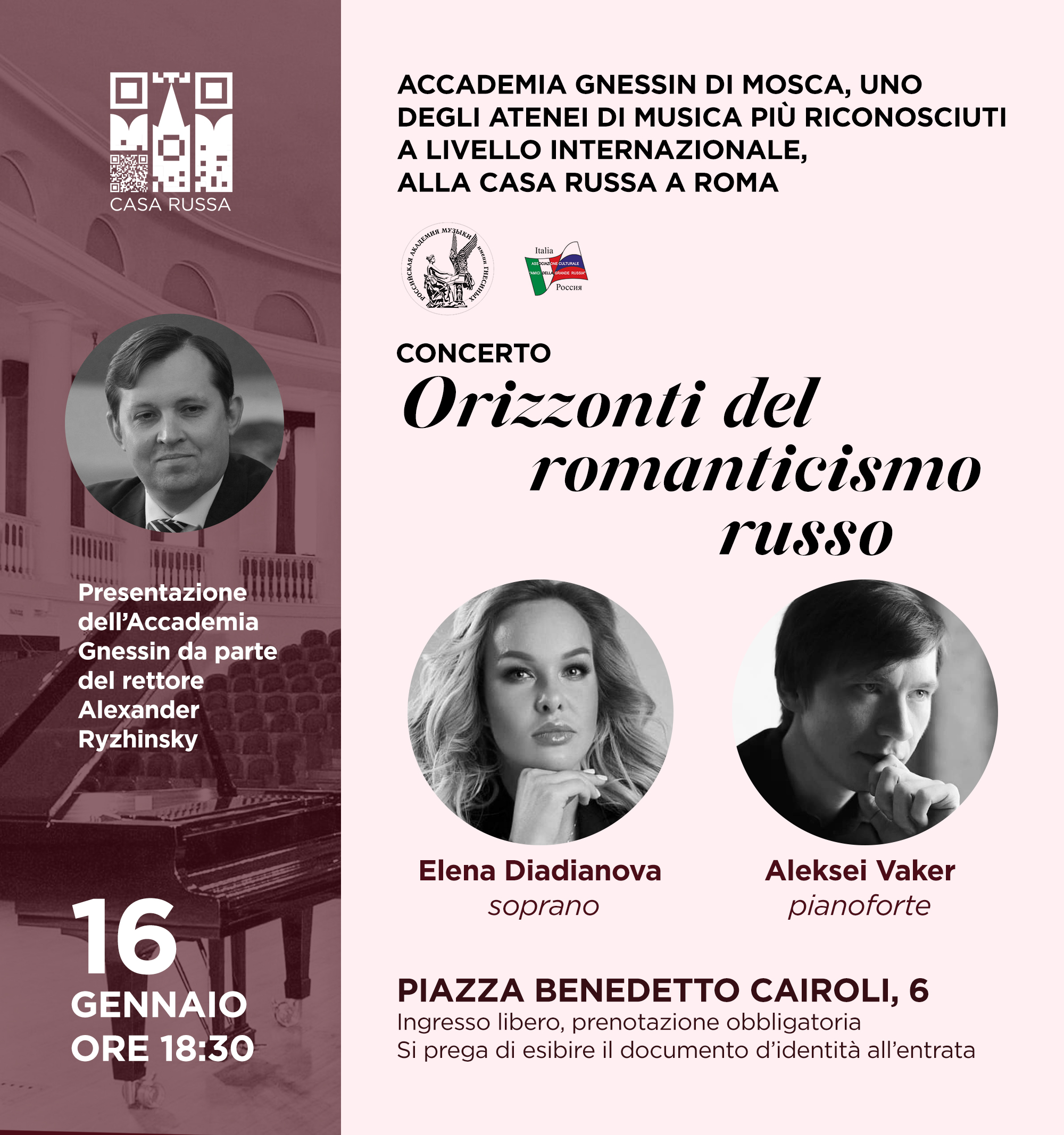 16 января в 18.30 по местному времени в Русском доме в Риме выступят преподаватели Российской академии музыки имени Гнесиных — певица Елена Дядянова (меццо-сопрано) и пианист Алексей Вакер.
