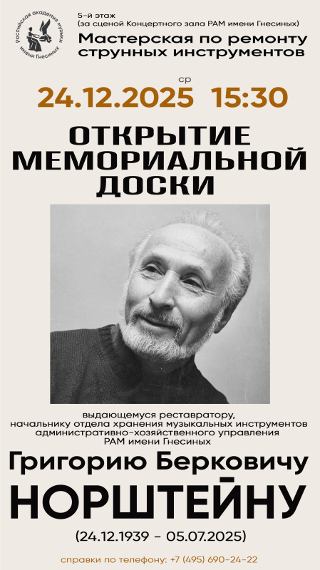 Открытие Мемориальной доски выдающемуся реставратору, начальнику отдела хранения музыкальных инструментов административно-хозяйственного управления РАМ имени Гнесиных Г. Б. Норштейну (1939-2025)