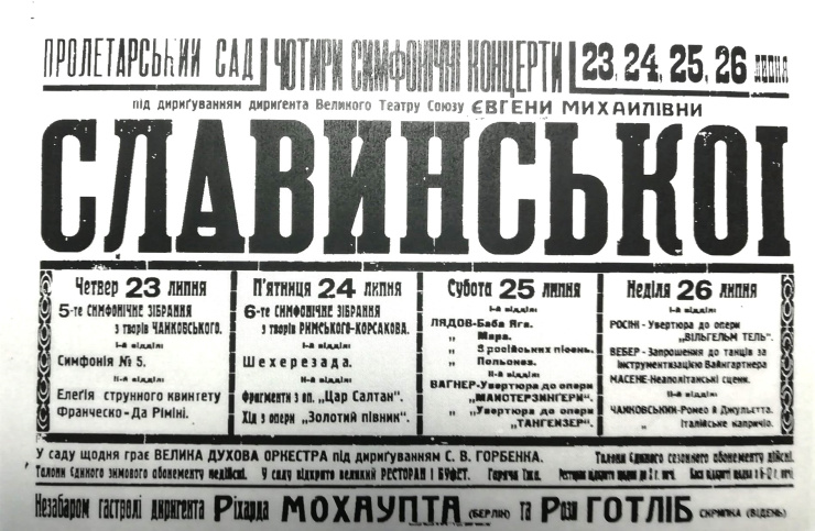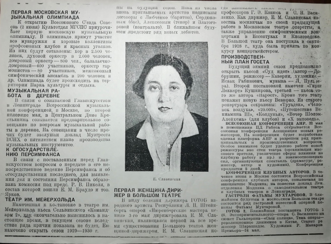 Уникальный музыкант и выдающаяся личность, Е. М. Славинская вошла в историю отечественной музыкальной культуры как первая женщина-дирижер в СССР и единственная за всю историю Большого театра, которому она отдала более 30 лет своей жизни (1928-1960).