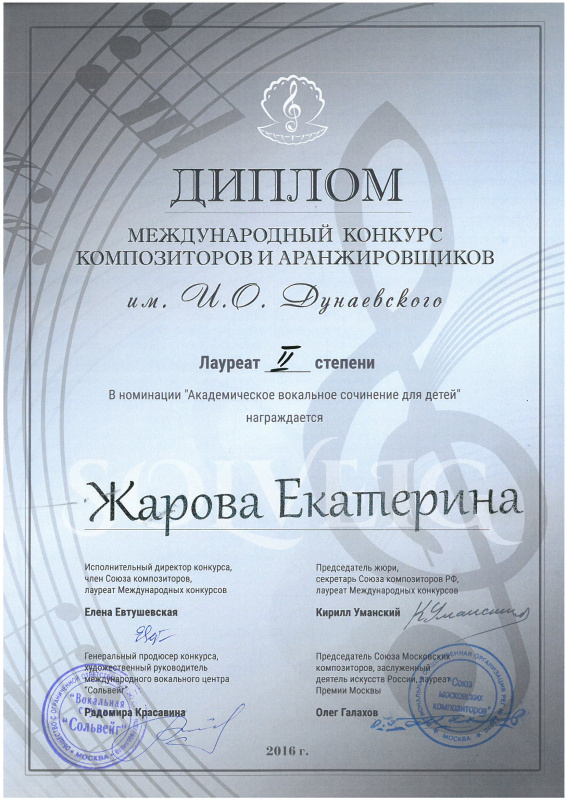 Поздравляем Жарову Екатерину, лауреата II степени Международного конкурса композиторов и аранжировщиков имени И. О. Дунаевского