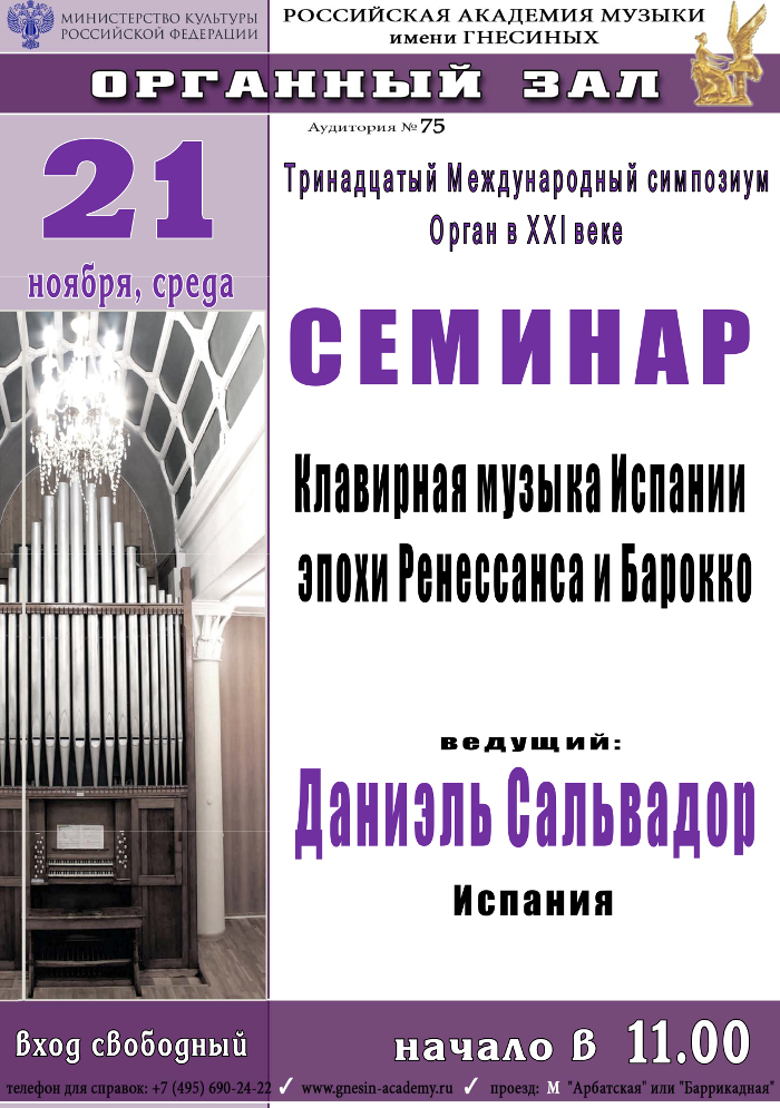 XIII Международный симпозиум «Орган в XXI веке» — семинар «Клавирная музыка Испании эпохи Ренессанса и Барокко», ведущий — Даниэль Сальвадор (Испания)