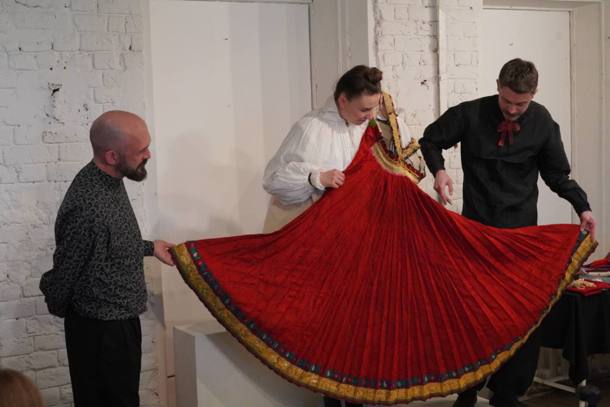 В этот раз экспертом процесса выступил Евгений Романов — исследователь русской традиционной культуры, руководитель этнического направления ЦРТК Российской академии музыки имени Гнесиных, настоящий знаток народного костюма. На встрече он представил одну из жемчужин своего собрания — свадебный костюм новобрачной из села Белица Суджанского уезда Курской губернии. «Моделью» Евгения стала Анна Литвиненко, преподаватель Центра, студентка Российской академии музыки имени Гнесиных.