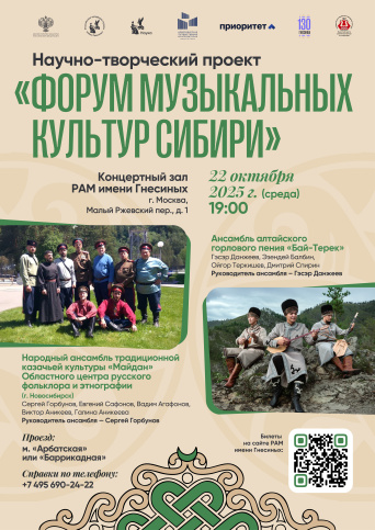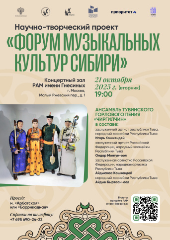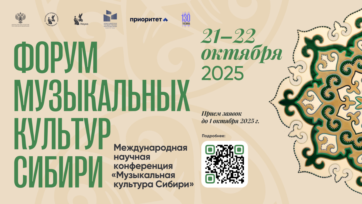 21-22 октября 2025 г. Российская академия музыки имени Гнесиных совместно с Новосибирской государственной консерваторией проводят Международную научную конференцию «Музыкальная культура Сибири» в рамках Форума музыкальных культур Сибири.