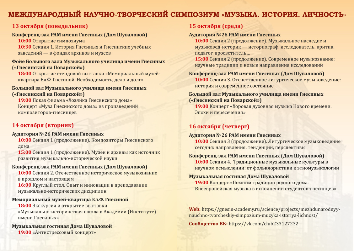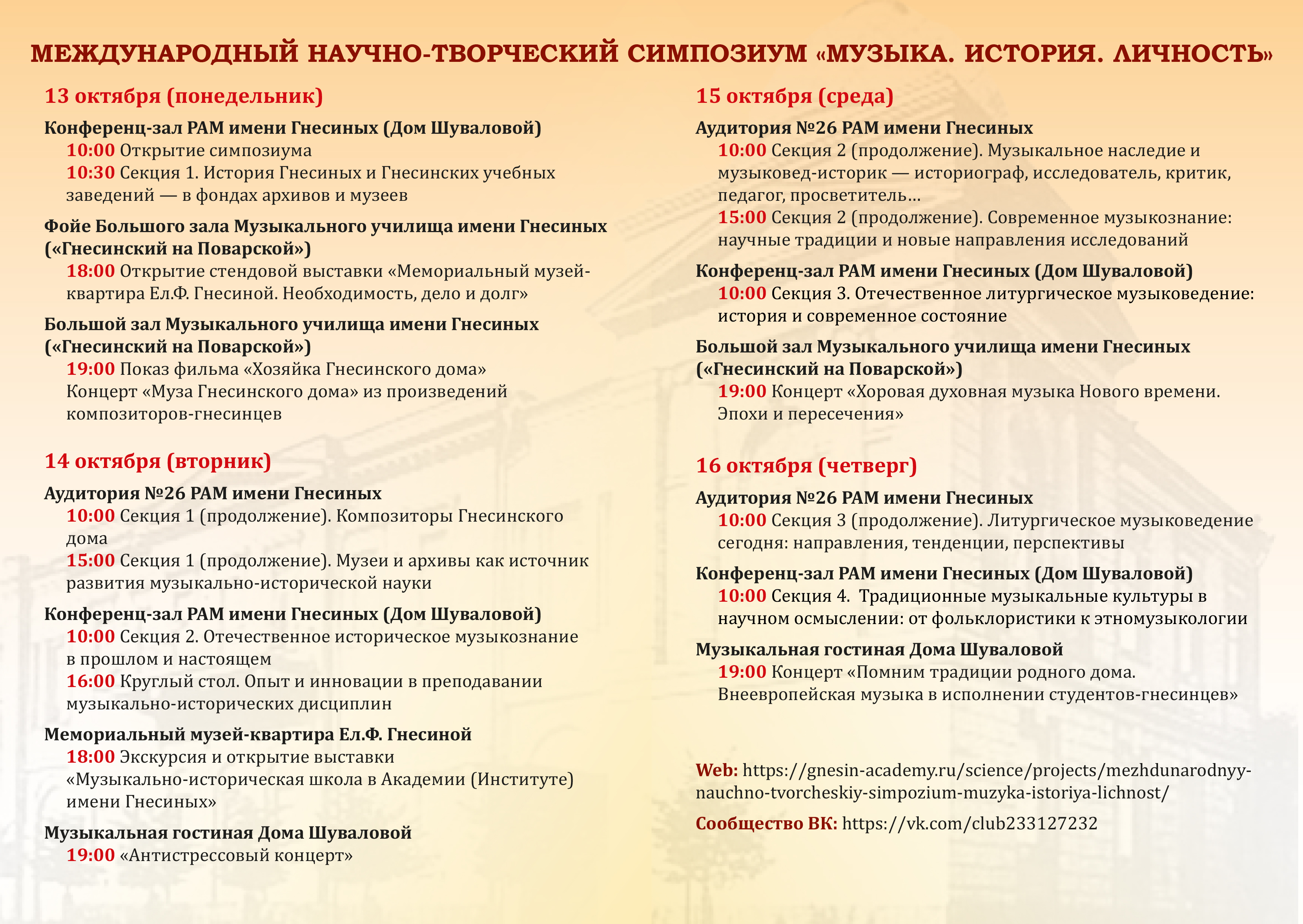 13-16 октября 2025 г. Российская академия музыки имени Гнесиных, кафедра истории музыки, Научно-археографический совет и Мемориальный музей-квартира Ел. Ф. Гнесиной приглашают вас принять участие в Международном научно-творческом симпозиуме «МУЗЫКА. ИСТОРИЯ. ЛИЧНОСТЬ», посвященном 130-летию ГНЕСИНСКИХ УЧЕБНЫХ ЗАВЕДЕНИЙ.