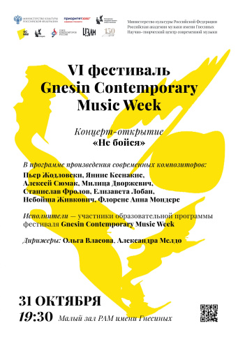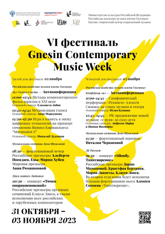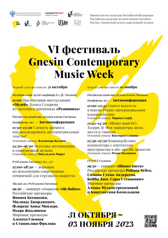 31 октября – 3 ноября 2023 года Научно-творческий центр современной музыки Российской академии музыки имени Гнесиных проводит VI фестиваль Gnesin Contemporary Music Week.