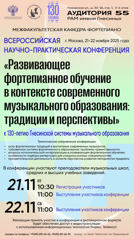 Адрес проведения конференции: 121069, г. Москва, ул. Поварская, д. 30/36, кафедра фортепиано (аудитория № 55).